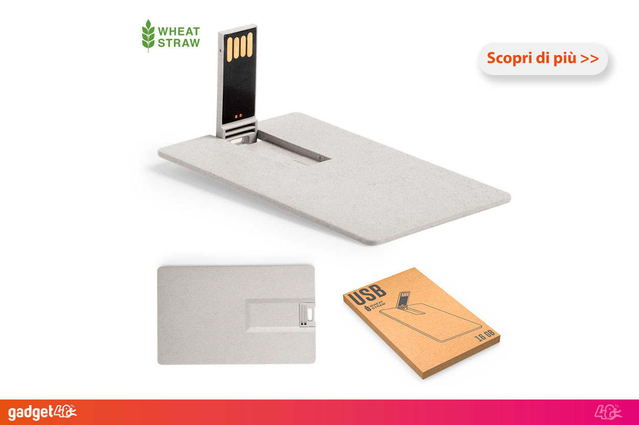 Se vuoi colpire i tuoi potenziali clienti con un gadget personalizzato originale, green, pratico e funzionale, potrai stampare il tuo logo aziendale sulle nostre chiavette usb in fibra di grano ecologiche a forma di tessera, da poter posizionare comodamente nel portafogli; la superficie di stampa ampia e la particolarità della forma attireranno l'attenzione sul tuo brand aziendale ottimizzando la tua strategia di marketing.